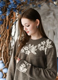 Круглая кокетка украшена многорядным узором, состоящим из фантазийных цветочных мотивов, вдохновлённых традиционной украинской вышивкой, которые в том же виде повторяются в нижней части рукава. Интарсия не используется.
